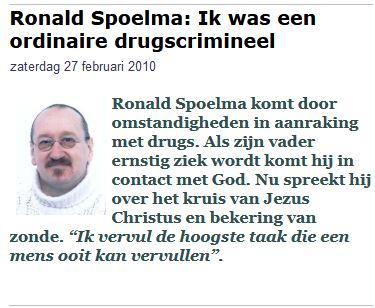 Het is wat Ronald betreft de vervulling van de Bijbeltekst, dat God dát, wat niets is, heeft uitgekozen om iets te zijn. Hij was niets, hij was waar de mensen op neerkijken, een ordinaire drugscrimineel, en hij deed zijn dingen in het verborgene. Maar nu schreeuwt hij het van de daken: Ronald was verloren, maar Jezus heeft hem gered! Vrijwel al zijn contacten en “zakenpartners” in die wereld zijn inmiddels vermoord, maar Ronald leeft en wijdt zich aan de allerhoogste taak die een mens ooit kan vervullen: het vullen van de hemel. Zijn toewijding is groot, want hem is veel vergeven.