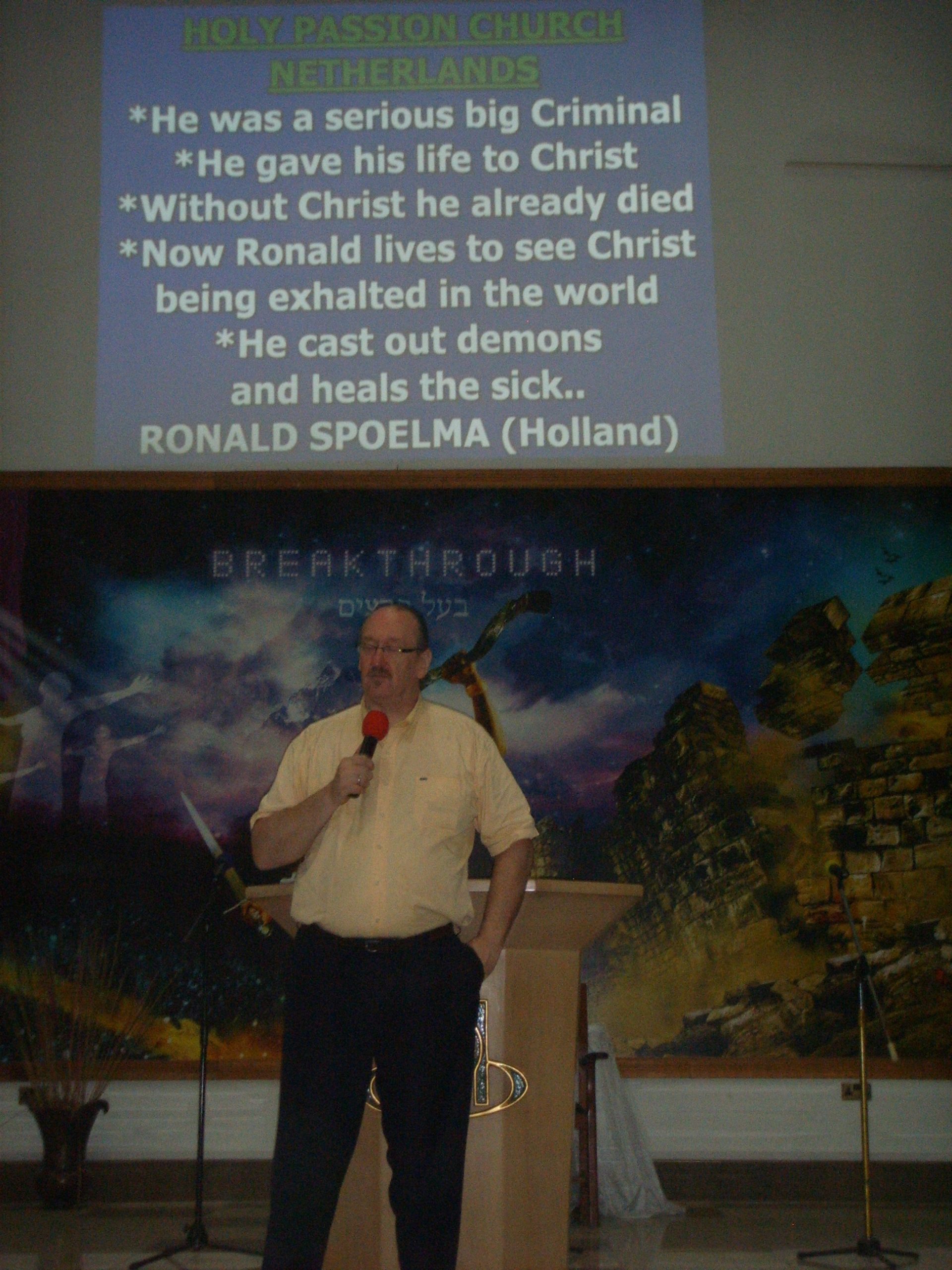 De vader van Ronald overleed vredig; God haalde hem in Zijn grote genade thuis, een paar dagen voordat Ronald en Maria gedoopt werden. Ronald begon kort na zijn doop in tongen te spreken. Met grote blijdschap over zijn redding legde hij één voor één zijn criminele zaken op het altaar. Dat was nogal belangrijk… in het begin zat hij doodleuk in de kerk met een pistool onder zijn vestje en betaalde hij anoniem tienden over het geld dat hij aan criminele zaken had verdiend! Maar God had wat geduld met hem, want Ronald kwam van heel diep en had even tijd nodig om te wennen aan het Licht. Totdat Heilige Geest Zelf na een paar maanden Ronald heel duidelijk maakte dat het nu echt tijd was om de Goliath van geld en macht te onthoofden. God verlangde excuses en vanaf dat moment een echt heilige levenswandel. En Ronald was gehoorzaam. Hij heeft van die dag aan zelfs geen paperclip meer weggenomen die niet van hem was.